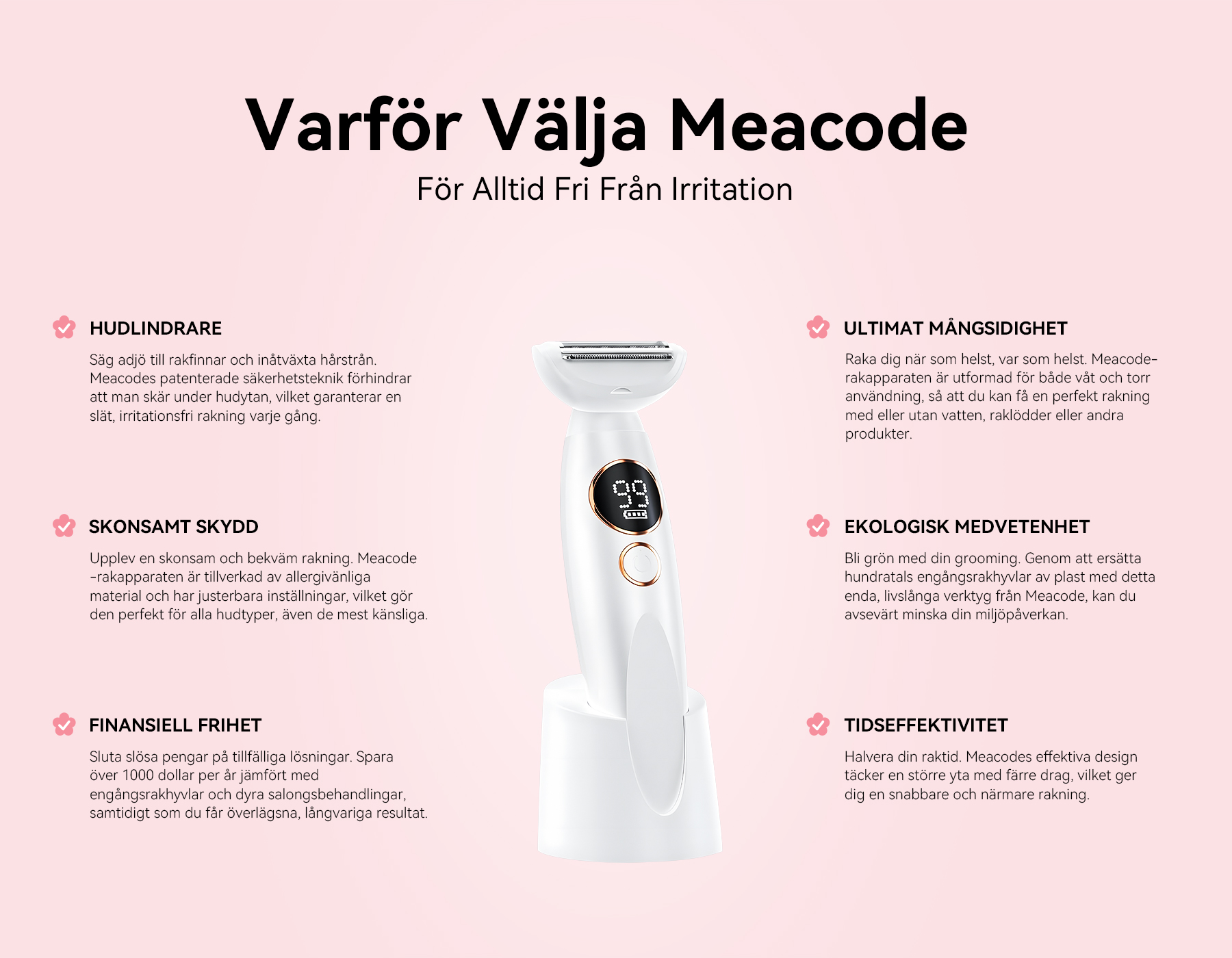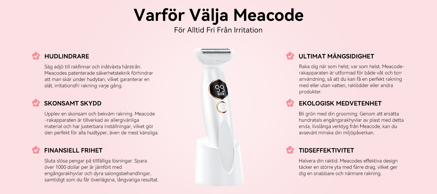På Meacode anser vi att teknik ska stärka, inte komplicera. Det är därför varje funktion – patenterad anti-skär-teknik, mångsidighet i ett, ergonomisk design – är framtagen för dig. Det är mer än en trimmer; det är din självförtroendeförnyare som hjälper dig att återta friheten och känna dig redo för vad som helst.