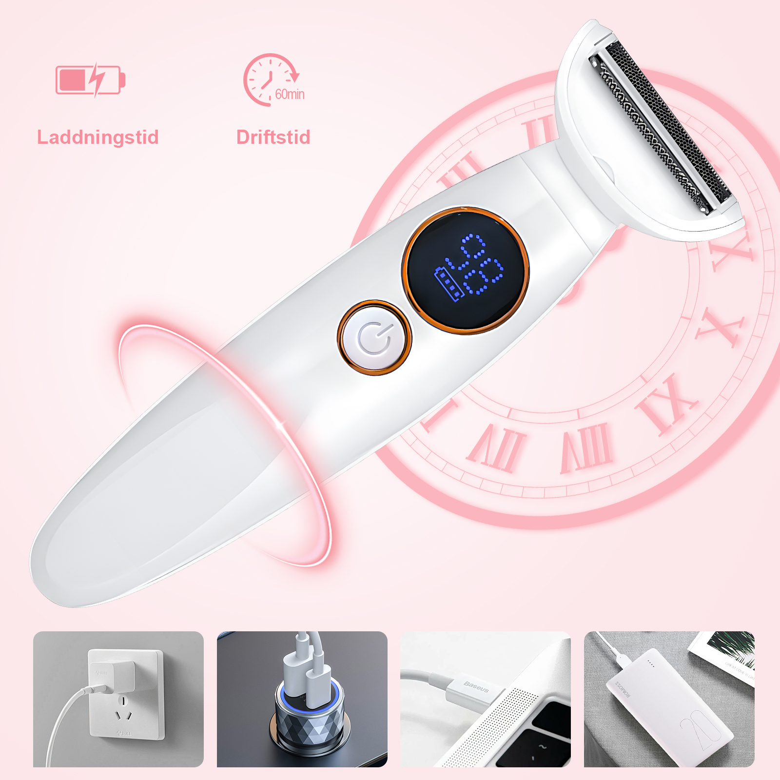 En full laddning ger dig 60 minuters trimningstid – tillräckligt för cirka 12 kompletta sessioner. Det snabbladdande batteriet når full kapacitet på 90 minuter, och en snabb 5-minutersladdning ger tillräckligt med ström för en enda bikinitrim. LED-indikatorn låter dig veta när det är dags att ladda, så du kommer aldrig att bli överraskad av en död trimmer.