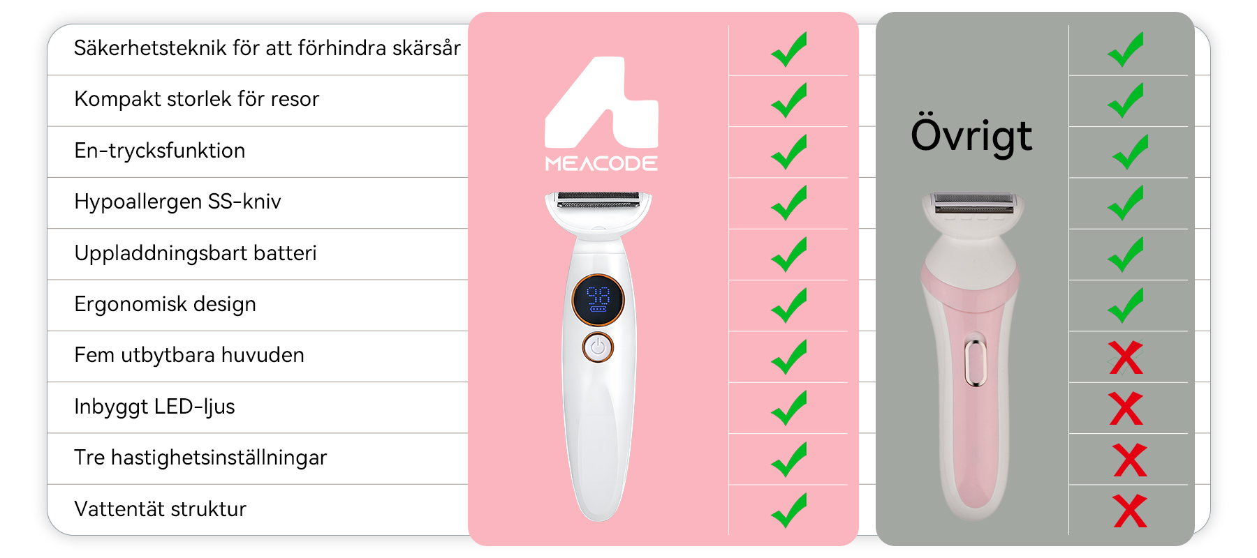 En traditionell rakhyvel kan kännas något närmare initialt eftersom den skär under huden, men det är det som orsakar inåtväxande hårstrån. Meacode skär på hudnivå, vilket är 95 % lika nära men utan det smärtsamma efterspelet. De flesta användare anser att en liten skillnad i initial jämnhet är väl värd att slippa rakbränna och knottror.