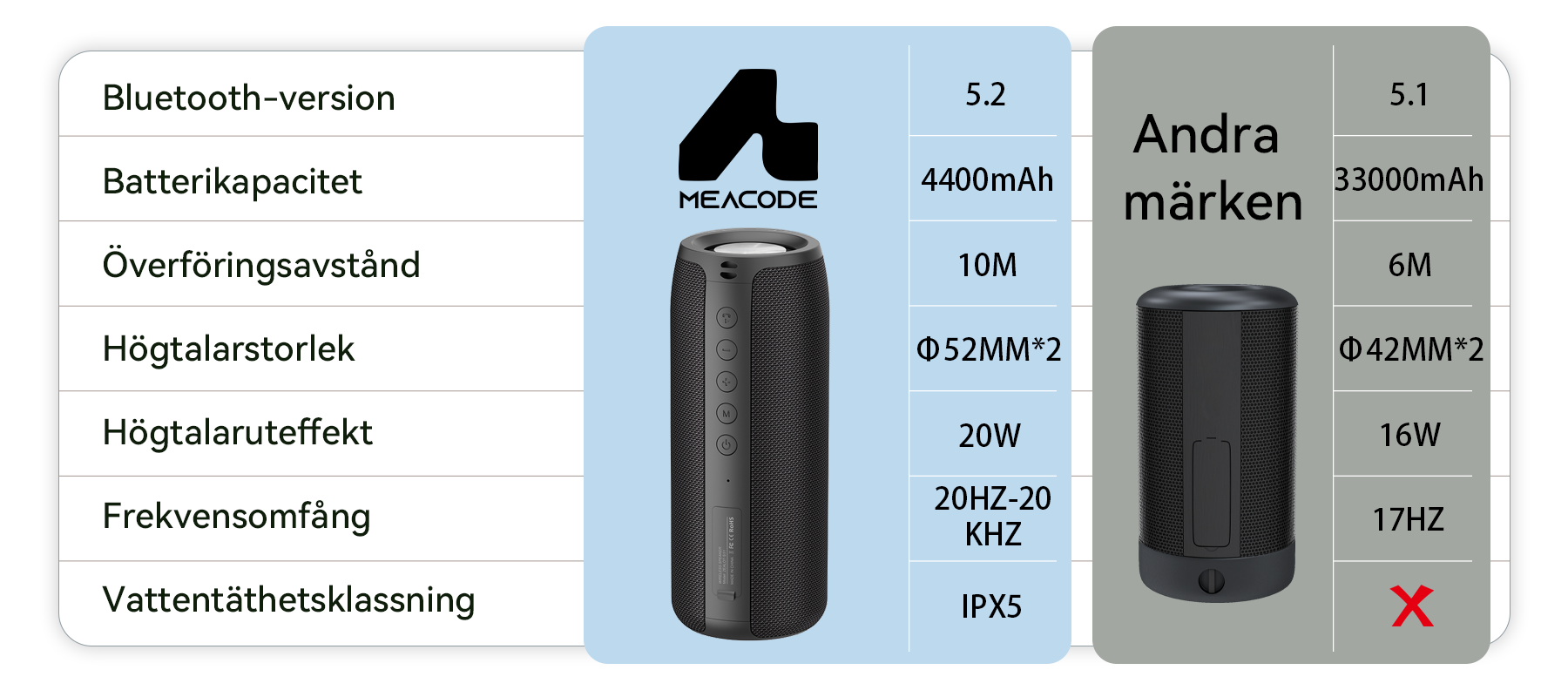 Meacode Bluetooth Speaker Använder Ett Avancerat Lågförbrukningschip Och Litiumbatteri-Teknologi Med Hög Densitet. Det Är Din Mest Pålitliga "Uthållighetskompis" På Långa Resor, Utomhusäventyr Eller Under Maraton Av Serietittande, Och Håller Din Musik, Dina Videor Eller Spel Igång Hela Tiden. Eliminera Batteriångest Och Omfamna Friheten.
