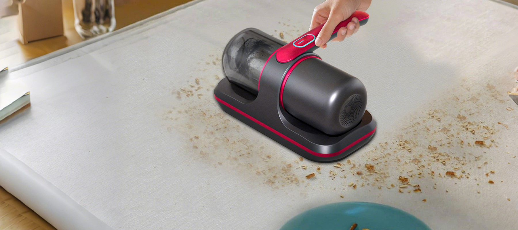 Meacode-dammsugaren för borttagning av kvalster har ett avancerat cykloniskt filtreringssystem. Under drift snurrar en kraftfull virvel av höghastighetsluft inuti dammbehållaren, vilket skapar en stark centrifugalkraft som effektivt separerar damm, hår och partiklar och tvingar dem att lägga sig mot behållarens väggar. Denna process säkerställer att filtret förblir fritt från igensättning och att sugkraften konsekvent förblir i sitt optimala tillstånd.