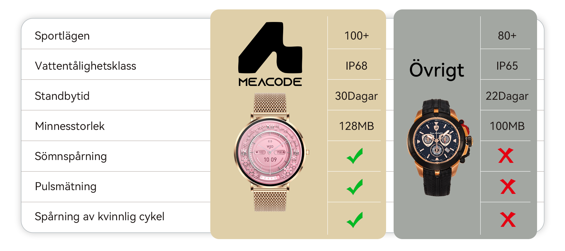 Meacode-smartklockan kombinerar avancerad hälsospårning med en elegant stil. Den övervakar ditt välbefinnande dygnet runt, håller jämna steg med ditt hektiska liv och fungerar samtidigt som en modeaccessoar.