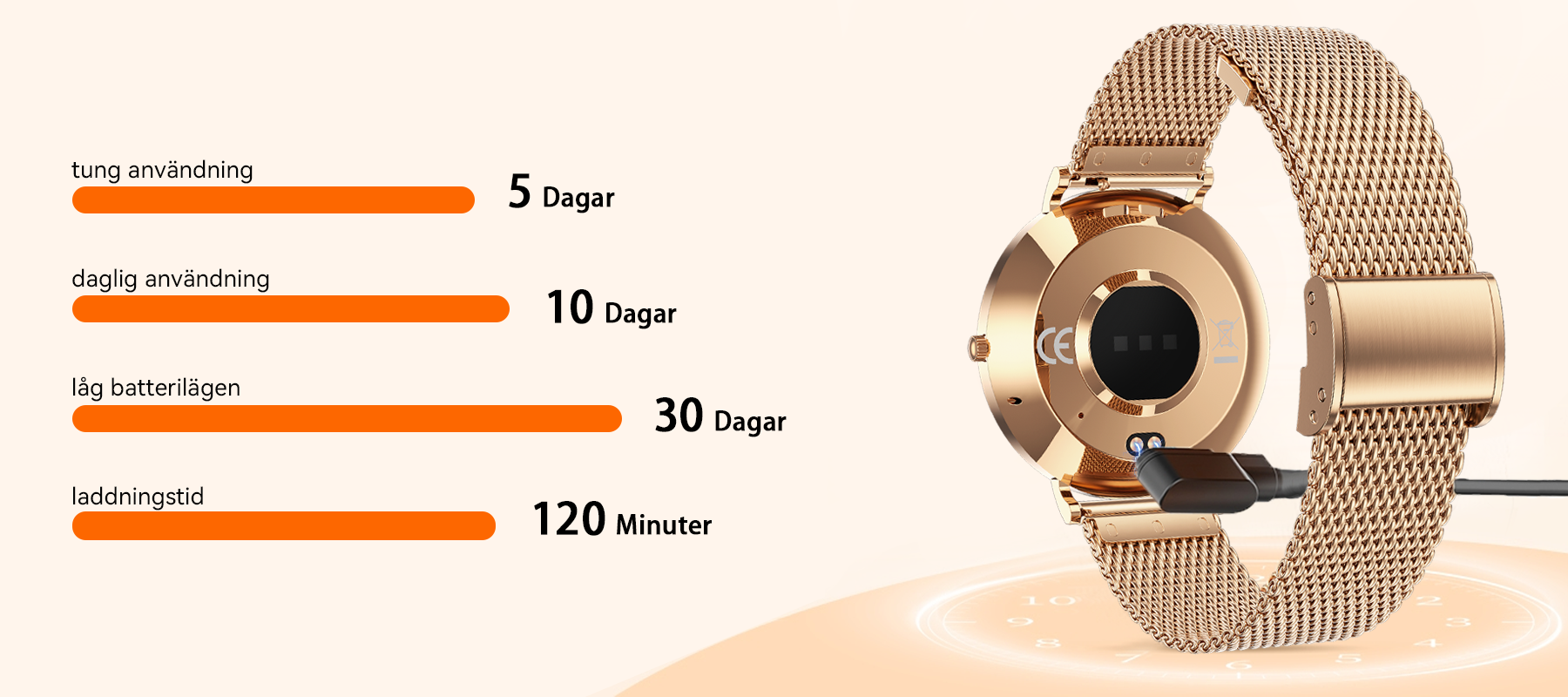 - Förlängd batteritid och snabbladdning: Njut av upp till 3-5 dagars användning på en enda laddning. Endast 15 minuters magnetisk snabbladdning ger dig ström för en hel dag.